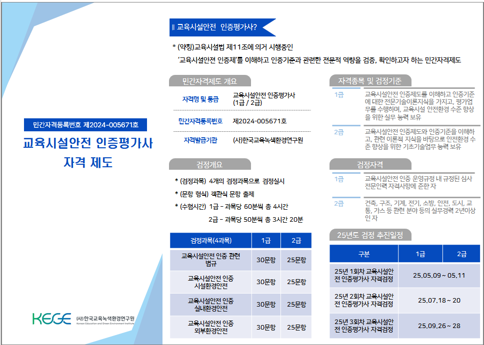 ¶ÇÇÑ º» ¹Î°£ÀÚ°ÝÀÎ ±³À°½Ã¼³¾ÈÀü ÀÎÁõÆò°¡»ç ÃëµæÀ» Áö¿øÇÏ°í ±³À°½Ã¼³¾ÈÀü ÀÎÁõ ³»¿ëÀ» ÀÌÇØÇϱâ À§ÇÑ º°µµÀÇ ±³À°°úÁ¤À» ¿î¿µÁß¿¡ ÀÖ½À´Ï´Ù.